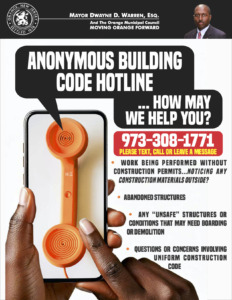 Anonymous Building Code Hotline info ANONYMOUS BUILDING CODE HOTLINE (1) Share This Post!Find us on FacebookCity Council of the City of Orange TownshipRecent Tweets Tweets by orangeccnj Recent Posts Shredding Event Public Notice Drawing for Ballot Position 2026 ECPO Summer Youth Internship Program Public Notice Historic Preservation Commission Meeting 2/18/2026 Cancelled Public Notice Special Meeting of Board of Adjustment 2/17/26 October 12, 2017 @ 8:00 am October 11, 2020 @ 5:00 pm Find out more kristen2025-06-10T17:38:44-04:00