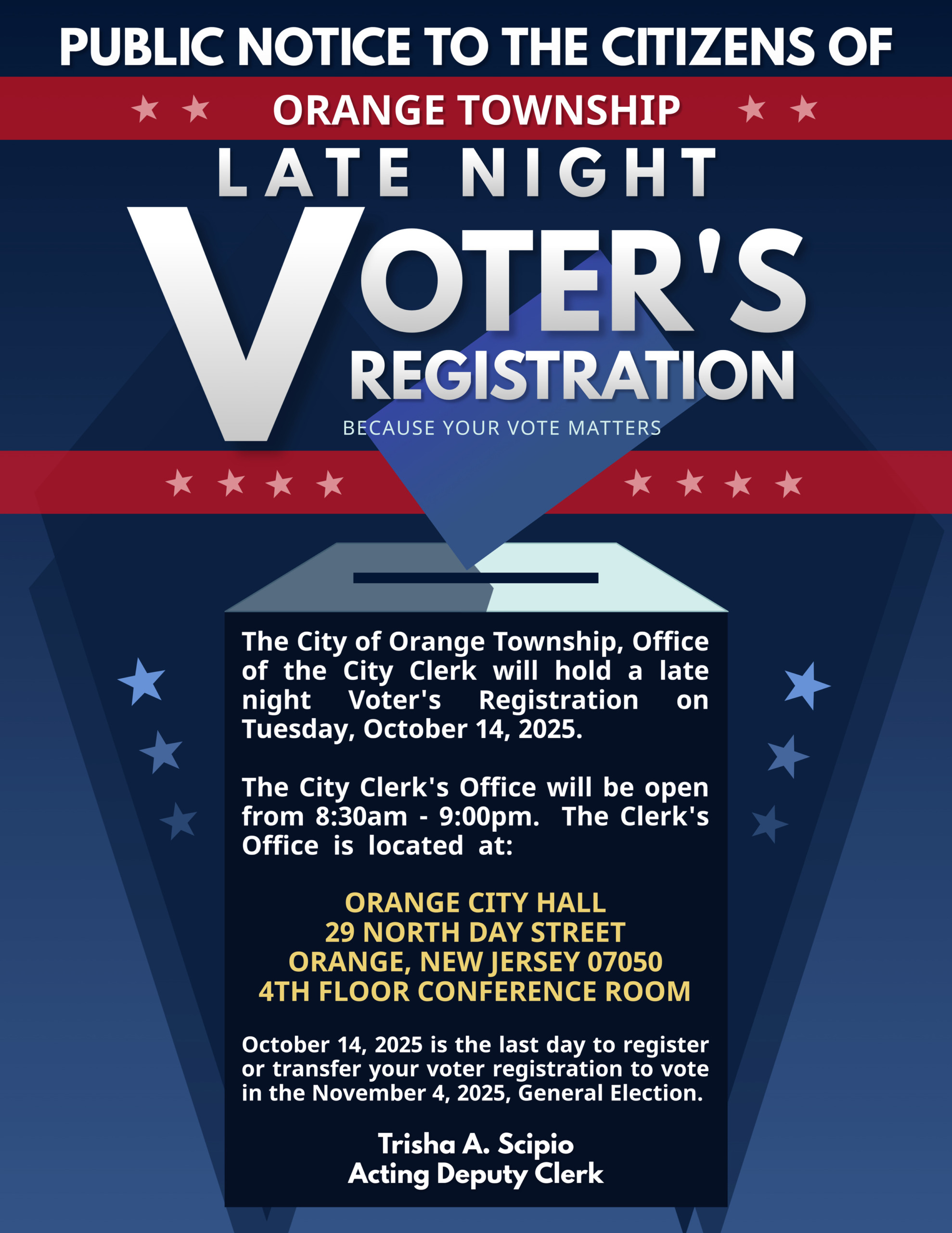 kristen2025-12-17T15:27:12-05:00PUBLIC NOTICE CITY OF ORANGE TOWNSHIP MUNICIPAL ELECTION MAY 12, 2026 The City of Orange Township will hold its Municipal Election on Tuesday, May 12, 2026 for Ward Council positions. The petitions will be available on January 6, 2026 between the hours of 8:30 A.M. to 4:30 P.M. in the City Clerk’s Office located at 29 North Day Street, 4 th Floor, Orange, New Jersey. Trisha A. Scipio Deputy Municipal Clerk