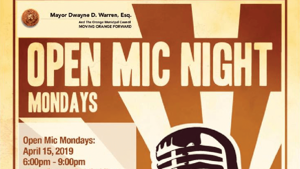 shannon2019-04-05T12:16:09-04:00Mayor Dwayne D. Warren, Esq And The Orange Municipal Council MOVING ORANGE FORWARD OPEN MIC NIGHT Mondays Date: Monday April 15, 2019 Time: 6:00 pm - 9:00 pm Place: Orange Public Library - 348 Main St, Orange Bring your talent and sign-up to perform! The BeatHaven Collective JUSTICE Rainmaker Hosted by JUSTICE from 360 POETRY NIGHT FREE Admission Live Music & Refreshments Transportation for Seniors is provided Please call 973-266-4053 or 973-266-4048