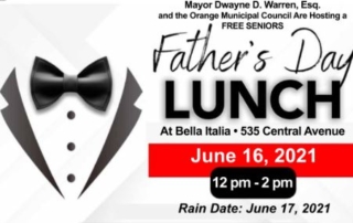 Mayor Dwayne D. Warren, Esq. and the Orange Municipal Council Are Hosting a FREE SENIORS Father's Day LUNCH At Bella Italia - 535 Central Ave, Orange June 16, 2021 12 pm - 2 pm Rain Date: June 17, 2021 Call the Office of Older Adults for Reservations or Transportation 973-592-8147