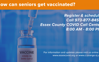 COVID-19 Vaccine ORANGE SENIORS Call 973-877-8456 - Essex County COVID Call Center 8:00 am - 8:00 pm to register and schedule your vaccination Please have your identification, insurance card (if you have insurance) and email address. Due to the amount of service calls, wait time may vary when calling for an appointment. Appointments are based on vaccine availability. TRANSPORTATION IS LIMITED Questions? Please Contact the Office of Older [...]