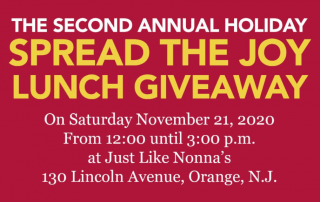 Orange Italian American Organization along with Just Like Nonna's present The Second Annual Holiday SPREAD THE JOY LUNCH GIVEAWAY On Saturday November 21, 2020 From 12:00 until 3:00 p.m. at Just Like Nonna's 130 Lincoln Ave, Orange, N.J. Just Like Nonna's will provide a Hot Lunch With a Pre-packed Drink & Dessert Just pick-up and go - please wear a mask "Life is about lending a hand and [...]