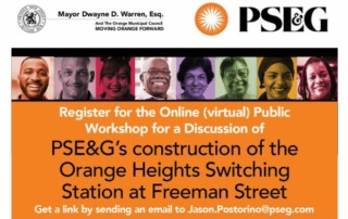 Register for the Online (virtual) Public workshop for a Discussion of PSE&G's construction of the Orange Heights Switching Station at Freeman Street Get a link by sending an email to Jason.Postorino@pseg.com Date: Thursday, February 3, 2022 Time: 6:30 pm to 8:30 pm Request a link for the virtual workshop by emailing your name and address to: Jason.Postorino@pseg.com You are invited to attend a virtual workshop about PSE&G's construction [...]
